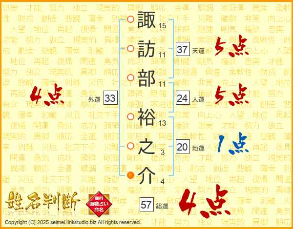 諏(15画)訪(11画)部(11画) 裕(13画)之(3画)介(4画)