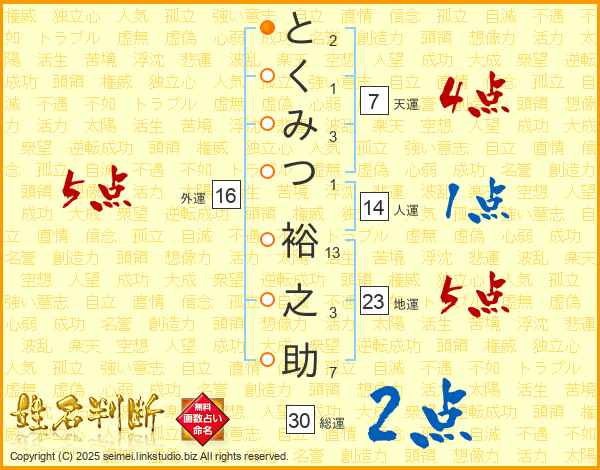 と(2画)く(1画)み(3画)つ(1画) 裕(13画)之(3画)助(7画)