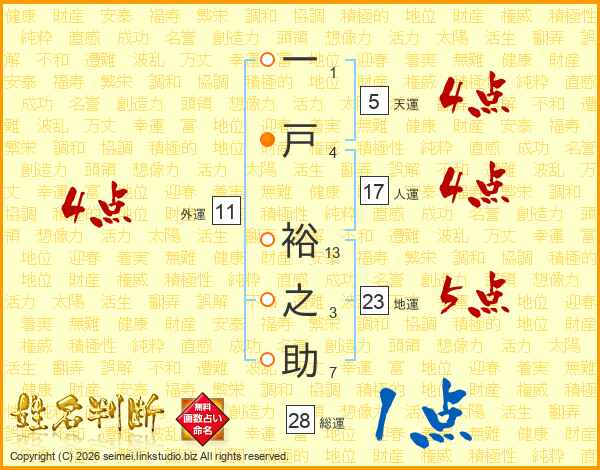 一(1画)戸(4画) 裕(13画)之(3画)助(7画)