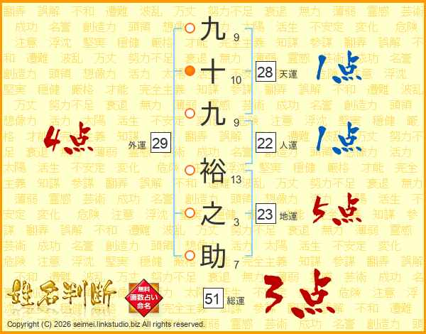 九(9画)十(10画)九(9画) 裕(13画)之(3画)助(7画)