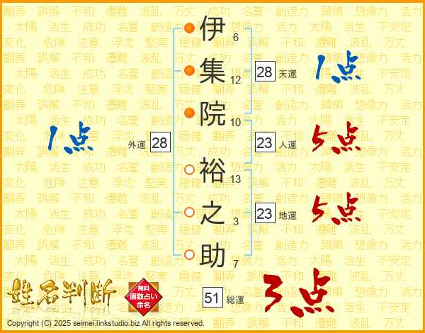伊(6画)集(12画)院(10画) 裕(13画)之(3画)助(7画)
