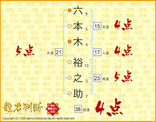 六(6画)本(5画)木(4画) 裕(13画)之(3画)助(7画)