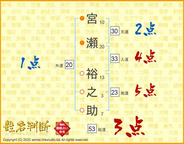宮(10画)瀬(20画) 裕(13画)之(3画)助(7画)