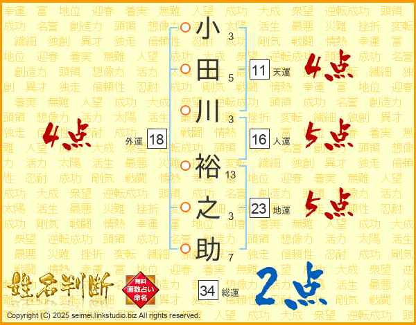 小(3画)田(5画)川(3画) 裕(13画)之(3画)助(7画)