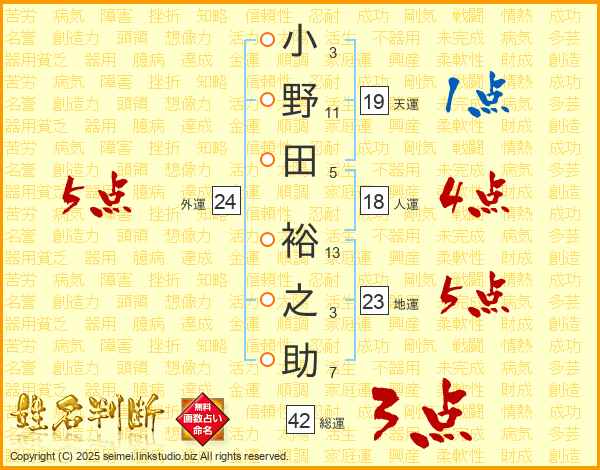 小(3画)野(11画)田(5画) 裕(13画)之(3画)助(7画)