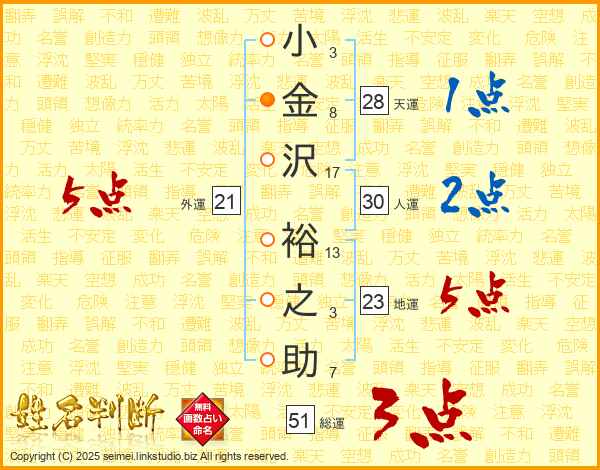 小(3画)金(8画)沢(17画) 裕(13画)之(3画)助(7画)