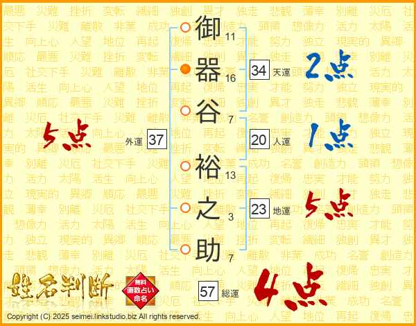 御(11画)器(16画)谷(7画) 裕(13画)之(3画)助(7画)