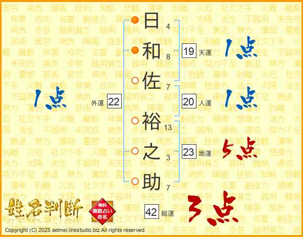 日(4画)和(8画)佐(7画) 裕(13画)之(3画)助(7画)