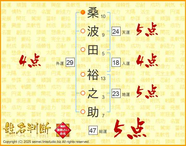 桑(10画)波(9画)田(5画) 裕(13画)之(3画)助(7画)