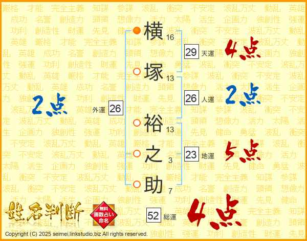 横(16画)塚(13画) 裕(13画)之(3画)助(7画)