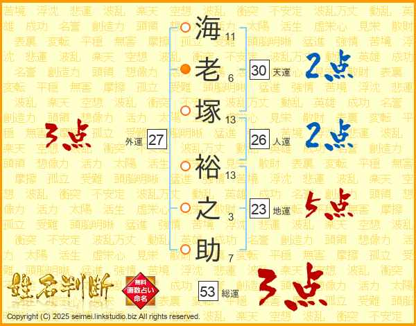 海(11画)老(6画)塚(13画) 裕(13画)之(3画)助(7画)