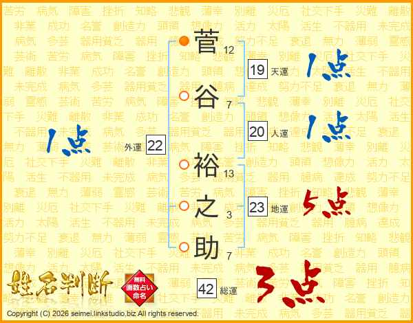 菅(12画)谷(7画) 裕(13画)之(3画)助(7画)