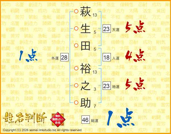 萩(13画)生(5画)田(5画) 裕(13画)之(3画)助(7画)