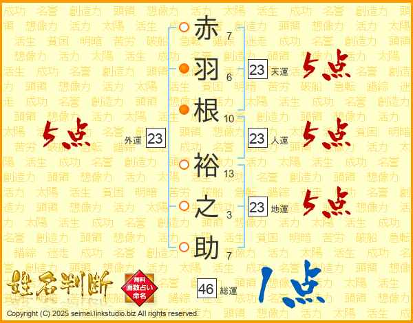赤(7画)羽(6画)根(10画) 裕(13画)之(3画)助(7画)