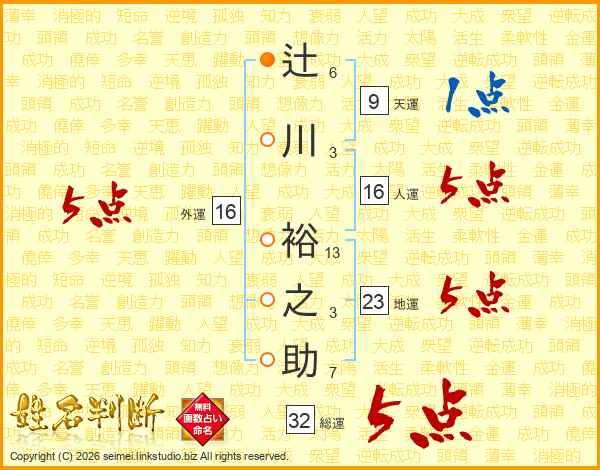 辻(6画)川(3画) 裕(13画)之(3画)助(7画)