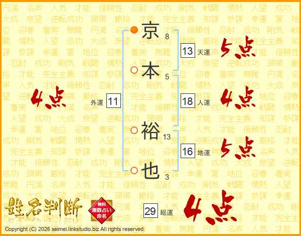 京本裕也さんの総運は29画の4点!