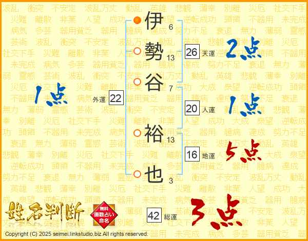 伊(6画)勢(13画)谷(7画) 裕(13画)也(3画)