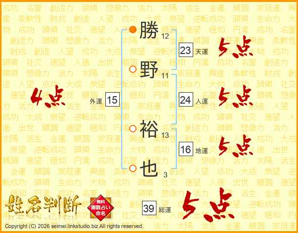 あなたの人生を表す1番重要な運勢です。生涯を通じて影響する総合運となり、主に50歳以降の晩年期に影響を及ぼします。苗字と名前の合計画数。