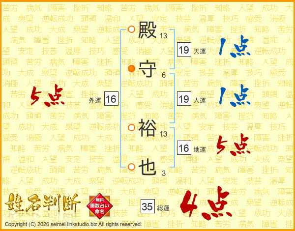 殿守裕也さんの総運は35画の4点!