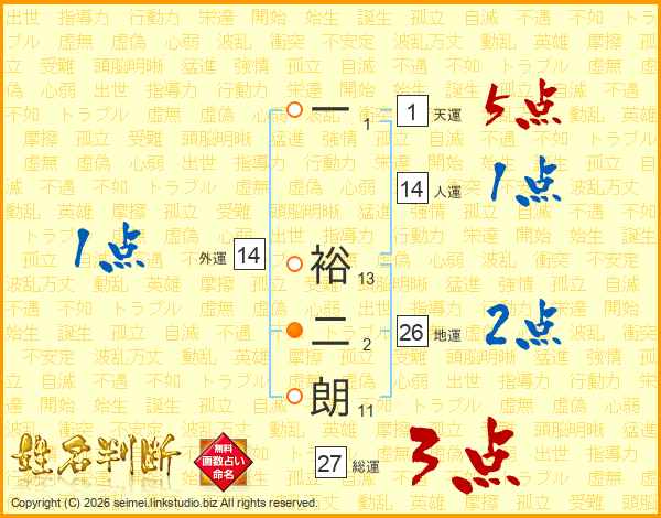 あなたの人生を表す1番重要な運勢です。生涯を通じて影響する総合運となり、主に50歳以降の晩年期に影響を及ぼします。苗字と名前の合計画数。