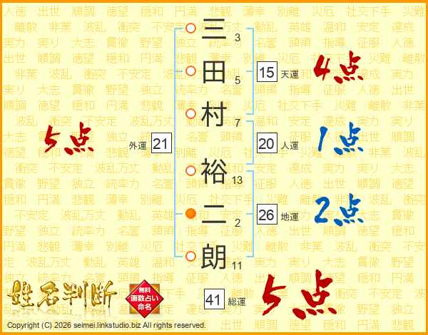 三(3画)田(5画)村(7画) 裕(13画)二(2画)朗(11画)
