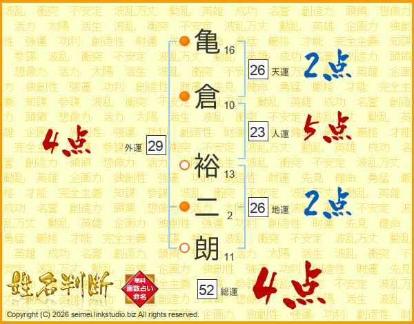 亀倉裕二朗さんの総運は52画の4点!