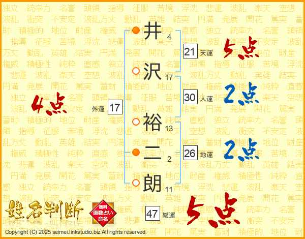 井(4画)沢(17画) 裕(13画)二(2画)朗(11画)