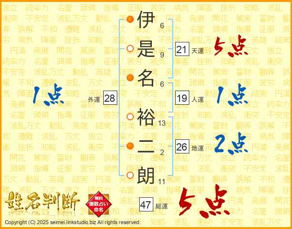 伊(6画)是(9画)名(6画) 裕(13画)二(2画)朗(11画)