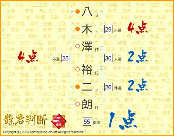 八(8画)木(4画)澤(17画) 裕(13画)二(2画)朗(11画)