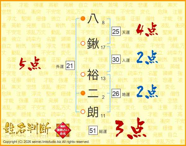 八鍬裕二朗さんの総運は51画の3点!