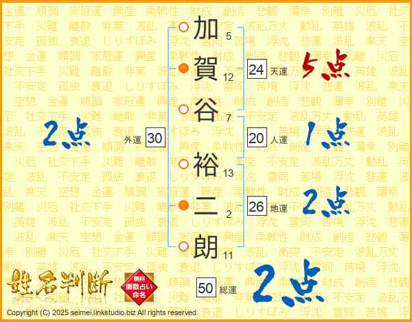 加(5画)賀(12画)谷(7画) 裕(13画)二(2画)朗(11画)