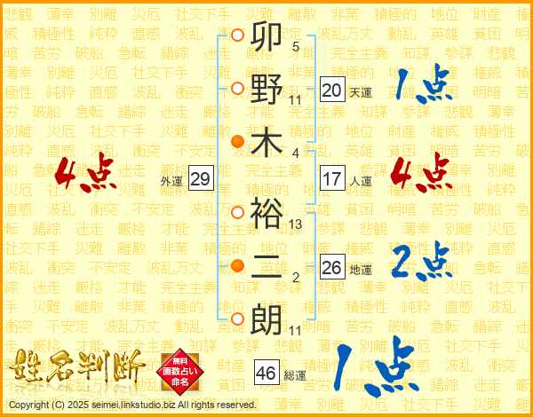 卯(5画)野(11画)木(4画) 裕(13画)二(2画)朗(11画)