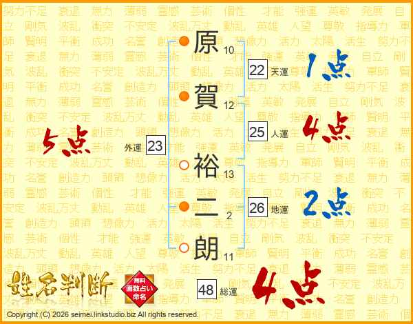 原(10画)賀(12画) 裕(13画)二(2画)朗(11画)