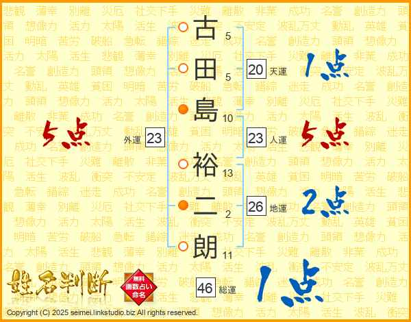 古(5画)田(5画)島(10画) 裕(13画)二(2画)朗(11画)