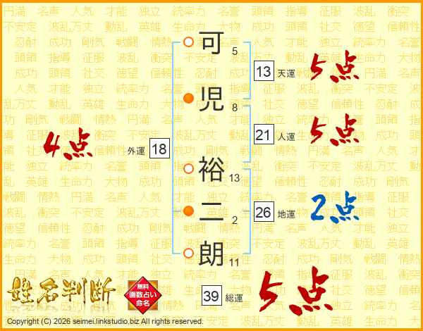 可(5画)児(8画) 裕(13画)二(2画)朗(11画)