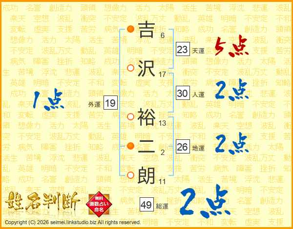 吉沢裕二朗さんの天運は23画の5点!