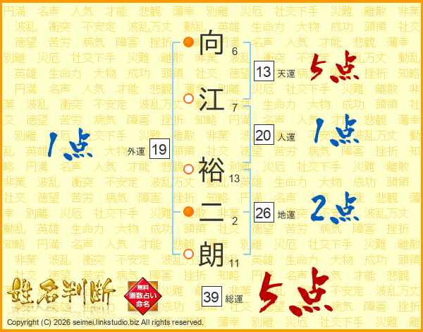向(6画)江(7画) 裕(13画)二(2画)朗(11画)