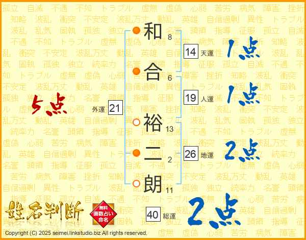 和(8画)合(6画) 裕(13画)二(2画)朗(11画)