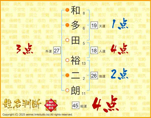 和(8画)多(6画)田(5画) 裕(13画)二(2画)朗(11画)