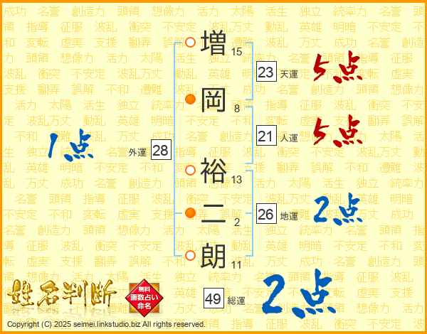 増(15画)岡(8画) 裕(13画)二(2画)朗(11画)