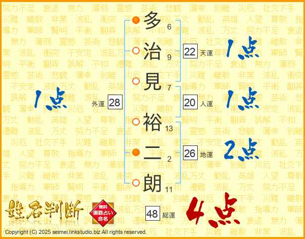 多(6画)治(9画)見(7画) 裕(13画)二(2画)朗(11画)
