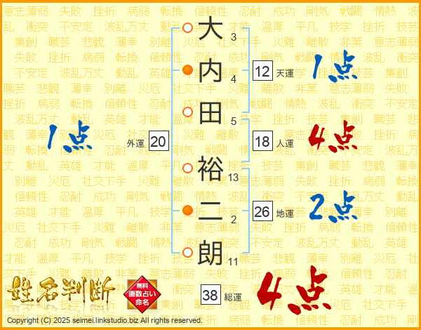 大(3画)内(4画)田(5画) 裕(13画)二(2画)朗(11画)