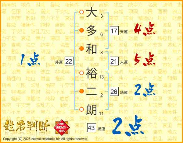 大(3画)多(6画)和(8画) 裕(13画)二(2画)朗(11画)