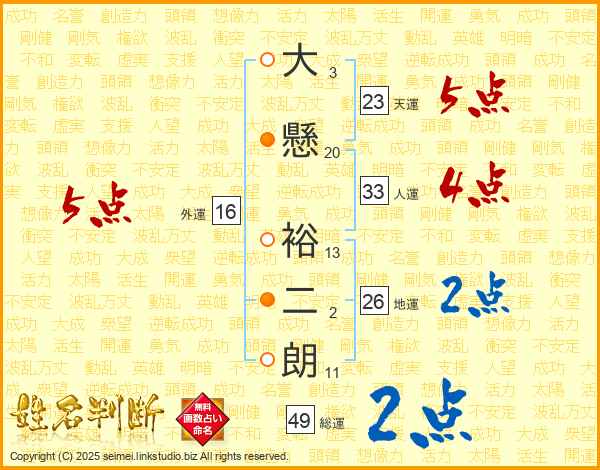 大(3画)懸(20画) 裕(13画)二(2画)朗(11画)
