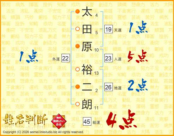 太田原裕二朗さんの総運は45画の4点!