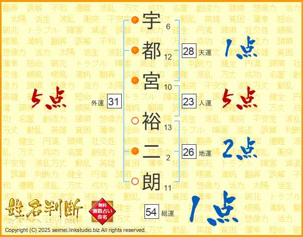 宇(6画)都(12画)宮(10画) 裕(13画)二(2画)朗(11画)