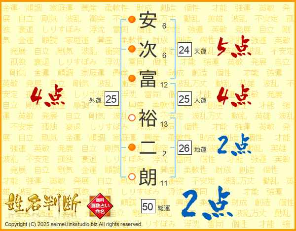 安(6画)次(6画)富(12画) 裕(13画)二(2画)朗(11画)