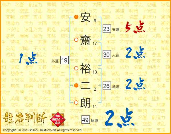 安齋裕二朗さんの総運は49画の2点!