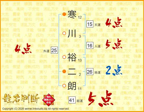 寒川裕二朗さんの総運は41画の5点!