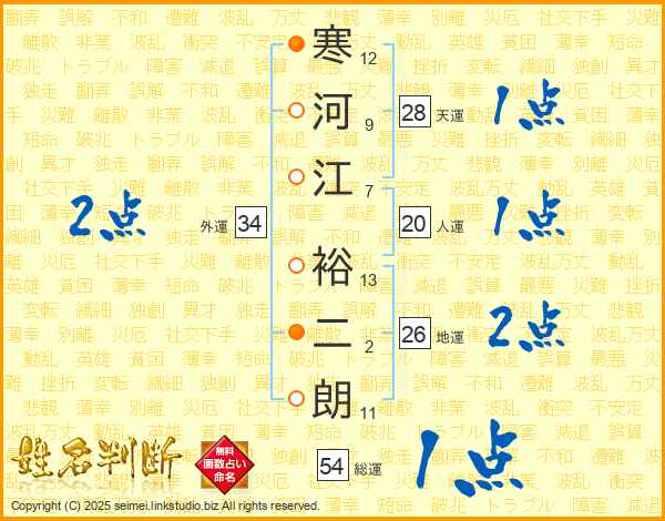 寒(12画)河(9画)江(7画) 裕(13画)二(2画)朗(11画)
